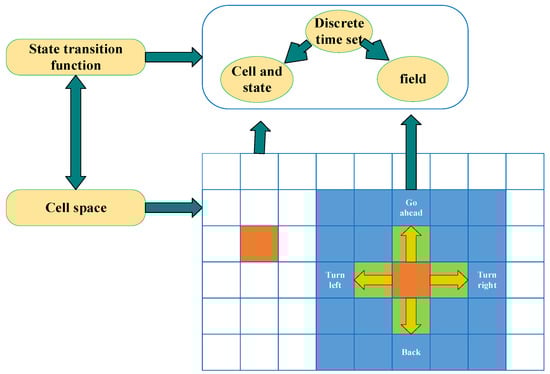 The cellular automata is a dynamic system which evolves in a discrete time dimension [,,,]. In cellular automata, a regular grid of a certain form is divided into many cells to form a cellular space. The cell is the unit in these regular grids, and its value range is a finite set of discrete states. The states of all the cells are updated according to the same evolution rules and certain local rules. The cellular automata is like a “field” acting in a shorter distance in traditional physics, which is a model of a discrete field []. The structure diagram of the cellular automata is shown in Figure 7. It should be noted that this is a plan view of the structure of the cellular automata.