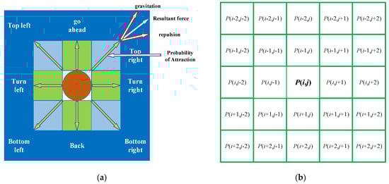 After calculating the distance between the cell and the preset exit, the next step is to consider the principle of preferential movement of the cell. By calculating the probability of each cell moving to each preset exit, this probability is set as the exit attraction probability. In addition, the midpoint probability of the cellular automaton is set to p(i, j). The extended Moore-type movement probability is shown in Figure 8b. The export attractiveness probability is expressed as: