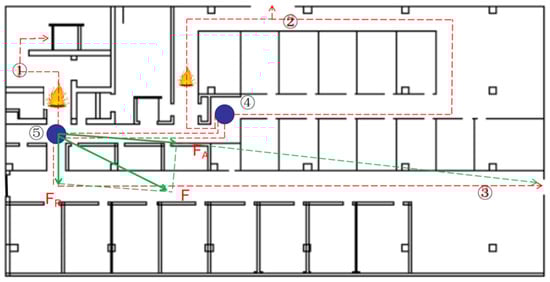 is the fire point; ①, ②, and ③ are escape exits, and the position of a single pedestrian moves from ④ to ⑤; FA is the attraction; FR is the resistance to judge the fire and obstacles; and F represents working together to effectively find a reasonable exit.