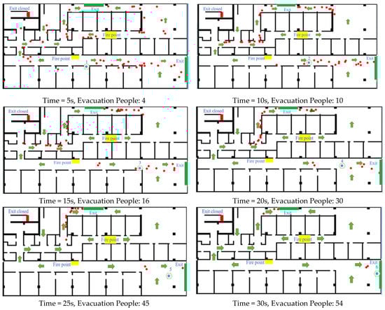 In Figure 11, a dynamic analysis of a single cell is performed at an interval of 5 s. In the evacuation process, each cell needs to use the cell movement probability selection shown in Figure 9 and the force analysis of the potential energy field method to obtain the most suitable path. The exit path of escape can efficiently avoid the point of fire.