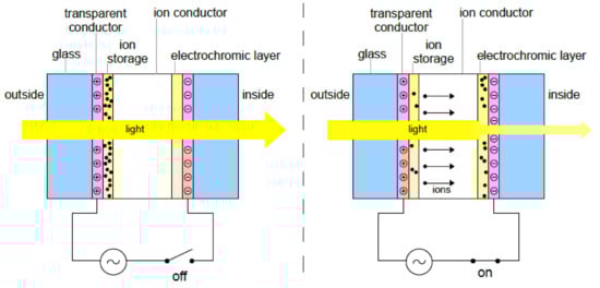 Among the diverse solutions that can be used to control window behavior, one of the most promising is represented by dynamic smart windows based on EC glazing (Figure 1). An EC glazing is a device resembling an electrical battery, generally including five superimposed layers, between two glass or plastic substrates, covered with transparent conductive oxides (e.g., indium tin oxide or fluorine-doped tin oxide): the middle layer is a transparent electrolyte (containing small cations, such as lithium or hydrogen ions). This layer is in direct contact with at least one EC material and an ion accumulation layer, or a further EC layer [4,5]. The most widely investigated EC materials are inorganic transition metal oxides, such as tungsten trioxide (WO3) or nickel oxide (NiO).