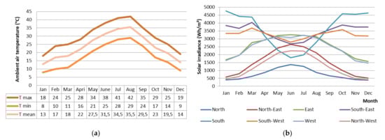 Climatic data were taken from the international weather for energy calculations database for the location of Biskra [51], where the climate is influenced by solar radiation, given in Figure 2b, that represents a summary of the different monthly average solar irradiation values for different exposures.