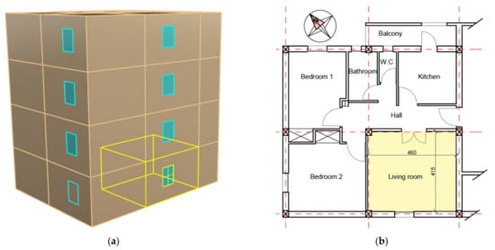 In the present study, the building context was a typical residential project located in the city of Biskra consisting of four floors, each one hosting two apartments, composed of two bedrooms, kitchen, bathroom, hall, and a living room; based on the Algerian national office of statistics [52], it represents a typical apartment in collective housing model in Algeria.