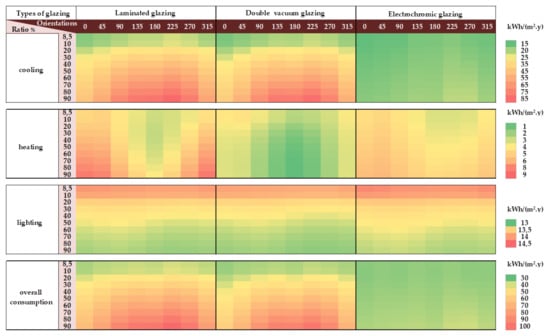 Figure 4 summarizes results from the investigated scenarios, showing that the highest energy consumption was found in the base case (laminated glazing), and for both alternative glazing, the results show a positive correlation between the WWR and the energy consumption. However, the increment is small compared to laminated glazing, due to a decrease in the amount of radiation entering the building.