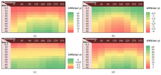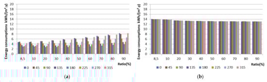 Furthermore, when the WWR is less than 10%, the difference between the eight orientations is insignificant, due to the decrease in sun radiation entering the building, and the heat transfer from outside to inside, while in the case of WWR 90%, the difference between the north and southwest facades reaches 39.31 kWh/(m2.y).