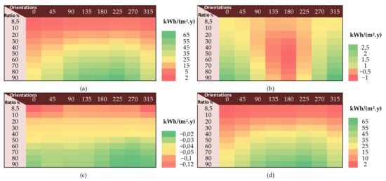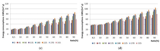 It is clear from the results that the energy consumptions were affected by the solar irradiation (Figure 2b). The highest heating needs were found in the case of north orientation, which receives the least amount of irradiation for the whole year. On the other hand, the southwest façade receives convergent irradiation during the different seasons (maximum in spring, 3678.33 Wh/m², and autumn, 3579.66 Wh/m²), which increases the cooling needs periods.