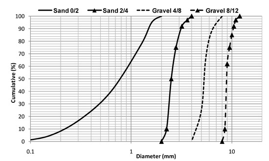The classic sieving method was used to determine the particle size distribution of the aggregates in conformity with standard NF EN 933-1 [22]. Figure 1 gives the particle-size distribution curve of the sand and gravel.