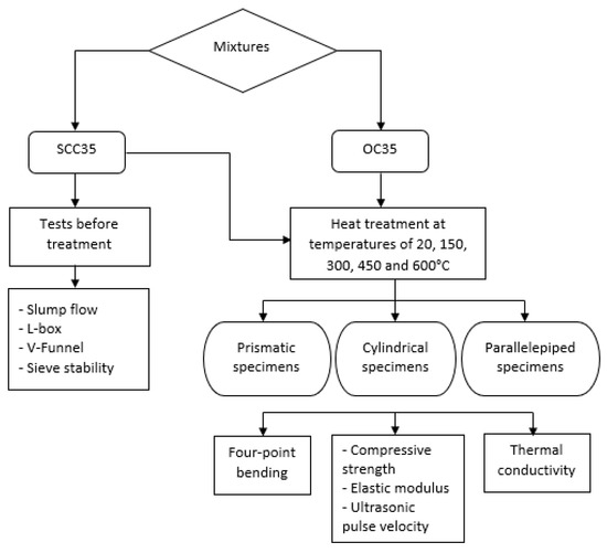 The specimens must be at least 90 days old at the time of the mechanical tests and must not remain outside for more than 2 h before the tests are carried out. The flow chart of the experimental study is given in Figure 3.