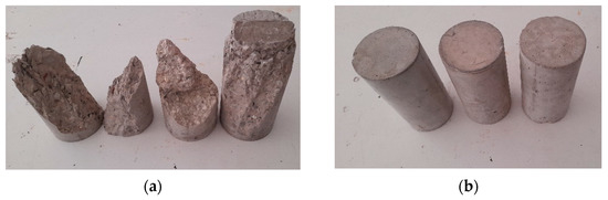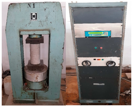 The compressive strength test was carried out on the cylindrical specimens in accordance with the requirements of EN 12390-3 [29]. The test consists of placing the test specimen between the steel plates of the hydraulic press and applying a continuous load until the specimen breaks (Figure 7). A compressive strength value RC was calculated using the following formula (Equation (4))