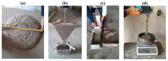 Characterization tests of SCC. (a) Slump flow test, (b) V-funnel test, (c) L-box test, (d) Sieve stability test.