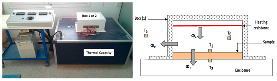 The measurement of the thermal conductivity was carried out on the parallelepipedal test specimens of dimensions 270 × 270 × 40 mm in accordance with the requirements of EN ISO 8990 [27]. The principle of this method is to send a unidirectional heat flow through a sample of material to be tested, then taking the measurements after obtaining the steady state (Figure 6). The sample to be tested is placed between a cold isothermal capacitor and a constant flux heat source; this flux is assumed to be unidirectional. The temperature gradient that is established between the two faces is then measured. Once the steady state is established, the thermal conductivity can be determined by the following formula (Equation (3)) [28]:
