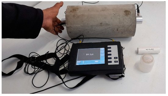 The ultrasonic pulse velocity (UPV) was determined in accordance with the requirements of EN 12504-4. The general principle of the UPV is to measure the speed of the mechanical wave propagating in concrete in transmission, in reflection, or on the surface (Figure 8). A pair of transducers is used for this, one serving as a source and the other as the receiver.