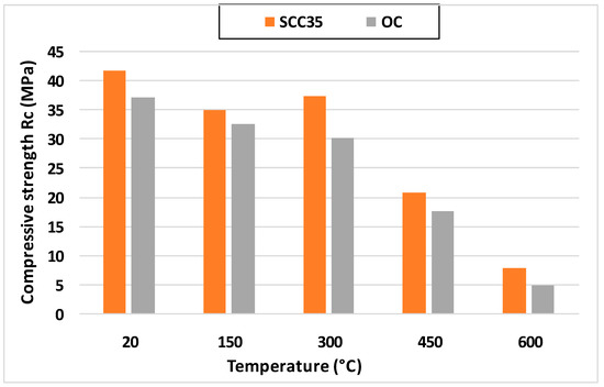 In the study of Sideris [13], the compressive strength of four SCCs and four conventional concretes (CC) of different strengths was determined. A speed of 5 °C/min was adopted for heating for temperatures at 100, 300, 500, and 700 °C. The results showed that for the same resistance class, the residual compressive strength of CC was lower than that of SCC mixtures. The two concretes SCC and CC presented the same spalling behavior and depended only on the category of resistance.