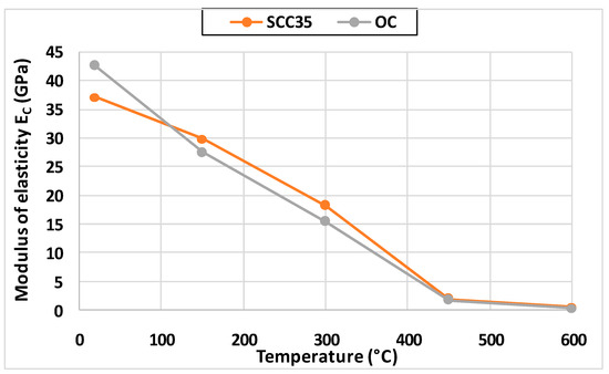 Up to a temperature of 300 °C, the SCC35 has an elastic modulus that is greater than 50% of the initial modulus.On the other hand, the elastic modulus of the OC35 is lower due to the appearance of micro-cracks on the specimens that were tested.