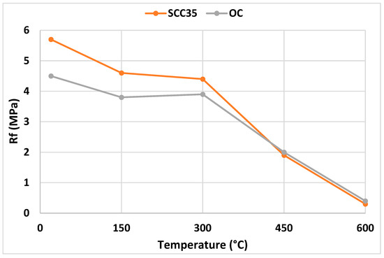 The evolution of flexural strength that was obtained from four-point flexural test depending on the temperature is presented in Figure 11. According to the results, it is noted that the residual flexural strength of the concretes decreases progressively with the increase in temperature. From 450 °C to 600 °C, the loss of residual tensile strength is remarkable. Moreover, the intersection of the curves takes place at 600 °C and this is due to the loss of mechanical properties of the concretes.
