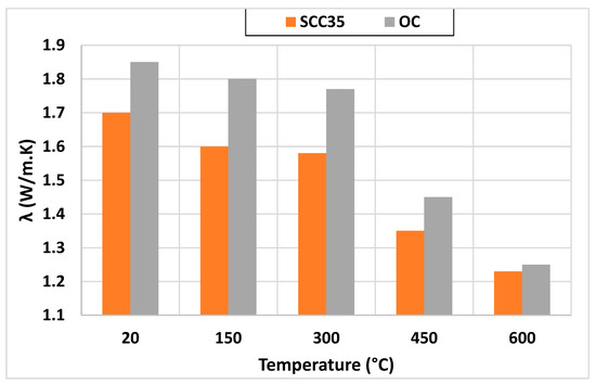 Janson et al. [15] measured the thermal conductivity and temperature fields in three different types of concrete: OC (W/C = 0.70, Rc28 = 38.5MPa), HPC (W/C = 0.28, Rc28 = 114.2 MPa), and SCC (W/C = 0.38, Rc28 = 92.3 MPa) up to a temperature of 600 °C. They noticed that the thermal conductivity of OC was lower than that of the HPC and SCC. On the other hand, the HPC and the SCC have very close conductivities.