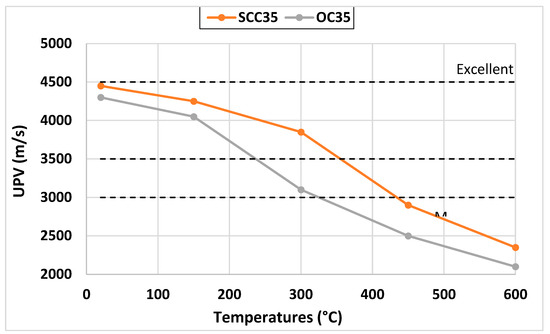 The measurement of the speed of the sonic waves (UPV) was carried out at the temperatures of 150, 300, 450, and 600 °C. According to the results that are presented in Figure 13, it is noticed that UPV decreases in a continuous way with the increase of the temperature because of the changes in the structure of the concrete.