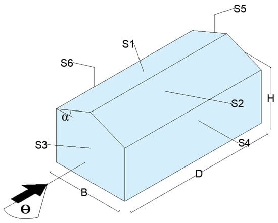 Low-rise gable roof building: (H—Height to mid-roof from ground level, B—Breadth of the building, D—Depth of building, θ—Direction of wind, α—Roof pitch, and “S” denotes surface).