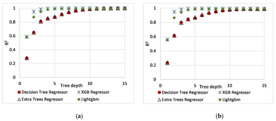 The grid search method was used to optimize the hyperparameters for all four tree-based models. Grid search considers different combinations of parameters and evaluated their respective output to obtain optimum values. Table 2 presents the optimized hyperparameters for each model. Their definitions are presented in Appendix A. Interestingly, tree-depth held a greater significance compared to the remaining hyperparameters. Figure 3 depicts how the accuracy of training and validation depends on tree-depth.