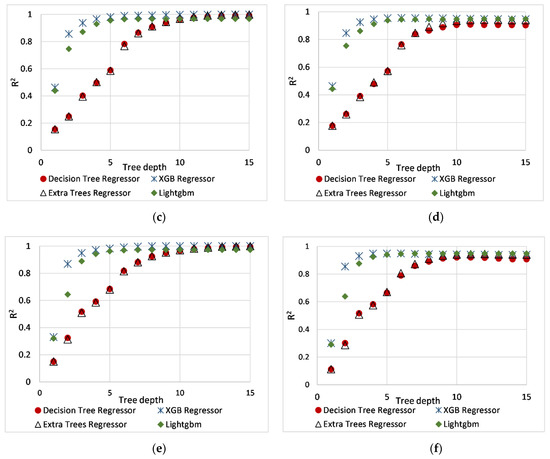 Variation of R2 with the depth of each tree model; training split = 60%, and validation split = 40%. (a) The training process of Cp,mean, (b) The validation process of Cp,mean, (c) The training process of Cp,rms, (d) The validation process of Cp,rms, (e) The training process e of Cp,peak, (f) The validation process of Cp,peak.