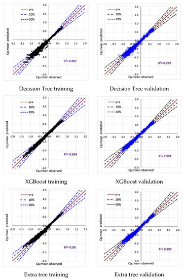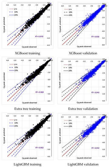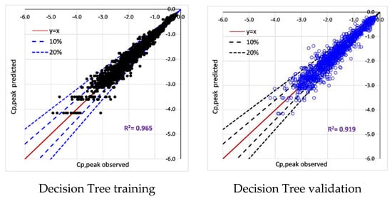 For Cp,peak predictions, negative peaks were only considered as they induce large uplift forces on the external envelope [84]. Generally, the external pressure on roofs is more important than the pressure on walls as the roof is subjected to relatively larger negative pressure compared to walls. Especially negative pressure on the roof surface is critical to assess vulnerability for progressive failures [85]. Even with surface averaging, values closer to −5 (See Figure 6) have been obtained. Compared to mean and fluctuation predictions, peak pressure predictions (validation) have deviations beyond the 20% error limit for all tree-based models. In the case of the Decision Tree model, substantial deviations are visible for lower Cp,peak values, compared to wind tunnel data. Repeatedly, the XGBoost model showcased superior performance (R2 = 0.955) with respect to the remaining models.