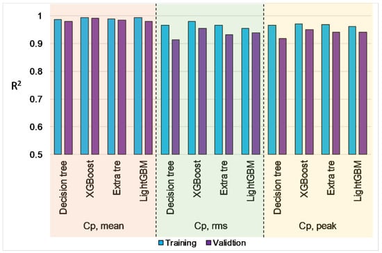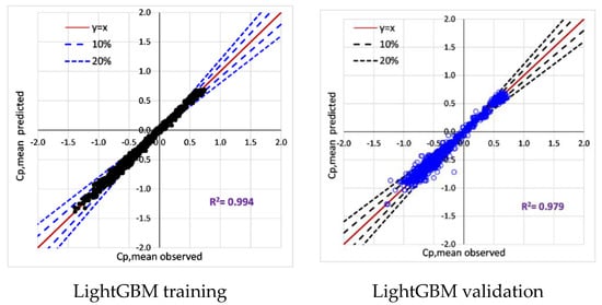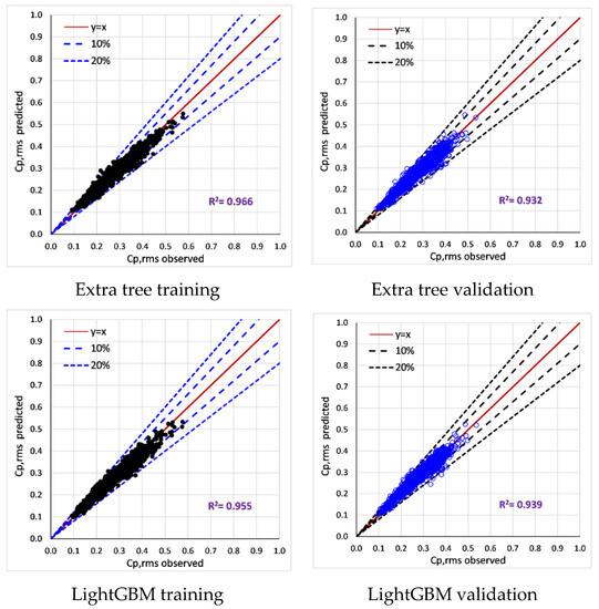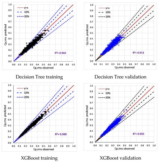 The coefficient Cp,rms represents turbulent fluctuations. Cp,rms is important, especially along perimeter regions where high turbulence is present. However, such localization was not feasible with the available data set due to the distinct pressure tap arrangement of each geometry configuration. Hence, for the present study, we had to employ (area-averaged) Cp,rms coefficient, which may not reflect localized effects. Nevertheless, the accuracy of validation predictions remains within a 20% error margin except for the Decision Tree regressor (see Figure 5). Both the XGBoost and LightGBM validation predictions are consistent, achieving relatively higher R2 values.