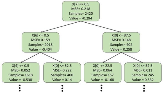 and are the average values of the response for each set. The tree generally intends to minimize the sum of squared error (SSE) (refer to Equation (4)) for each split. The tree starts growing with recursive splits and split thresholds. The terminal node represents the average of y values of samples collected within the node.