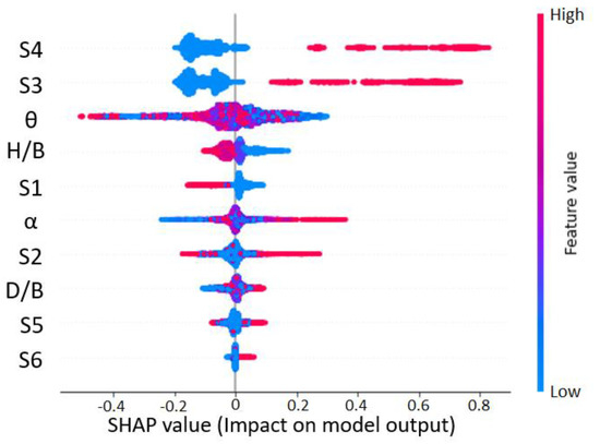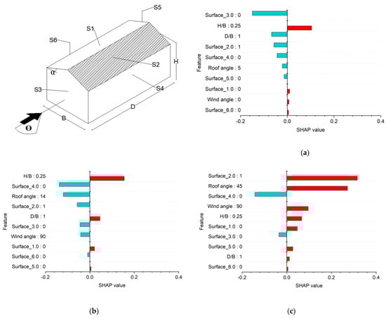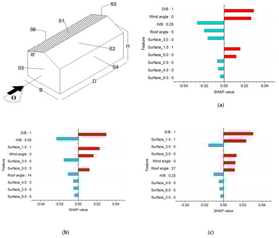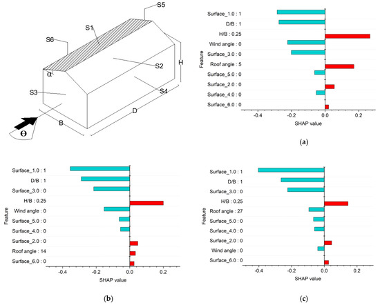 The horizontal axis determines whether the impact is negative or positive. Feature values are denoted using red and blue color, whereas the former indicates higher feature values and the latter represents lower values. For example, wind angle contains several distinct values. Therefore, SHAP identifies values closer to 90° as higher feature values and values closer to 0° as lower feature values. Further, all surfaces are binary variables such that “1” (Higher feature value) means that the instance belongs to a particular surface and “0” (Lower feature value) indicates that the instance does not belong to the corresponding surface. SHAP identified that if instances belong to surface 4, there is a higher possibility to make a positive impact on the model whereas “not being surface 4” influences a low negative impact on the model. Generally, surface 3 and surface 4 experience positive Cp,mean values when it is facing a windward direction. Therefore, a considerable positive effect can be expected on the model output as identified by SHAP. Subsequently, concatenated blue-colored values explicate that there are more instances where a low negative impact occurs due to lower feature values.