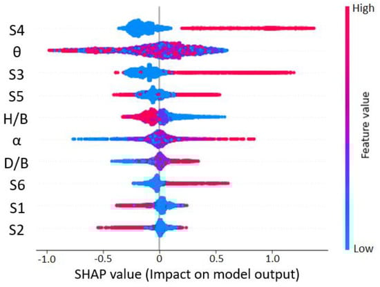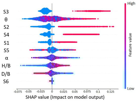 Repeatedly, Surface 3 (S3) and Surface 4 (S4) provided a comparable effect on Cp,peak (See Figure 11). In addition, Surface 5 and Surface 6 (roof halves) show a similar effect on model output except for the fact that surface 5 can influence both positive and negative effects on Cp,peak. A notable difference was observed from the θ that influences a relatively higher negative effect on the ML model regardless of feature value. On the contrary, roof pitch (α) creates a dissimilar effect compared to θ, whereas higher feature values create a positive impact and lower features create a negative impact. H/B and D/B ratio creates a completely different impact on Cp,peak. Compared to the Cp,rms, the effect of surfaces 1 and 2 has been reversed. Less notable features observed in Cp,mean have become considerably important for the Cp,peak. The overall effect of surfaces 3 and 4 was similar for all forms of predictions. The effects of H/B and D/B were comparable for Cp,mean, and Cp,peak but completely reversed for Cp,rms. There exist instances in which the effect of wind direction and roof pitch appeared to be less dependent on feature values. However, we recognized that a completely different impact was observed from wind direction and roof pitch. The effect of roof surfaces becomes pronounced Cp,peak.