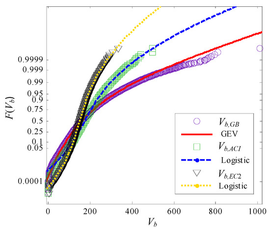 The samples of the model uncertainty Kpb can be obtained by Equation (3) with the samples of the beam capacity Vb. When the VP in Equation (3) is calculated, the measured values of material properties and geometrical dimensions should be used to exclude material uncertainties and geometric uncertainties.