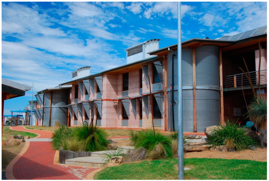 - Johnston, L. Deep Green: Charles Sturt University, Thurgoona Campus, NSW. Archit. Rev. Aust. 2000, 73, 94–99. [Google Scholar]