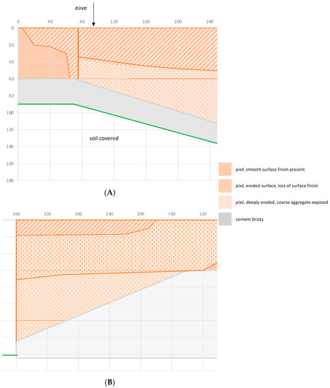 - An original surface with a rougher texture and some loss of detail compared to the surfaces of the control walls that are roofed and protected from the environment.