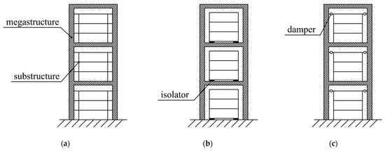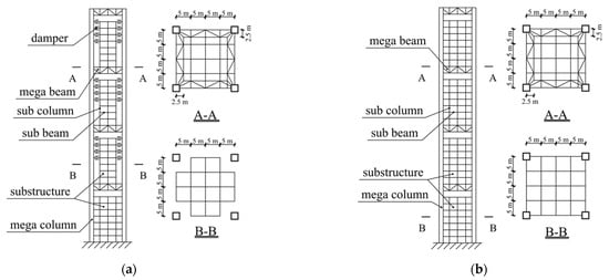 With the growth of the urban population, the demand for high-rise buildings is increasing. Mega-frame structure (MFS) is a type of structure that appeared in response to this demand. The megastructure of MFS consists of mega beams and mega columns. Solid web tubes or trusses are adopted as mega columns, and large hollow rectangular members or trusses are used as mega beams. The substructure is composed of ordinary beams and columns. Vertical loads on the substructure are transferred to the mega beams. The lateral stiffness of MFS depends on the stiffness of mega beams and columns. The substructures can be designed in various forms [1]. To reduce the dynamic response, Feng et al. [2] proposed an improved MFS called mega-frame with a vibration control substructure (MFVCS) with reference to the vibration control principle of tuned mass damper (TMD). MFVCS is also known as a mega-sub controlled structure. In this new structure, dampers or isolators were installed between the substructures and megastructures (Figure 1), and the function of the substructure is similar to that of the additional mass in TMD [3]. Many experiments and analyses showed that MFVCS has better response control ability than MFS [4,5,6,7]. Recent investigations have been devoted to further expanding and improving the design theory of MFVCS. Kalehsar et al. [8] compared the along-wind and crosswind responses of MFVCS and TMD, and investigated the influence of the mass ratio and stiffness ratio of the megastructure to the substructure on wind-induced vibration control of MFVCS. Fan et al. [9] calculated the failure path of MFVCS under random earthquake excitation by using the weighted rank–sum ratio method, and analyzed the weak members of the structure. Abdulhadi et al. [10] explored the appropriate stiffness ratio and mass ratio to reduce the seismic response of MFVCS. Shahzad et al. [11] proposed a modified MFVCS structure with isolators installed on mega columns.