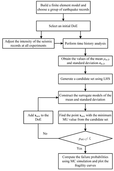 Surrogate model approaches can give the approximations of structural responses and are very popular in reducing the computational cost. The dual surrogate model (DSM) framework is often used to describe the variability of optimization objectives in robust optimization, which employs two surrogate models to predict the mean and standard deviation of structural performance, respectively [18,19,20,21]. Towashiraporn [22] proposed the DSM-based seismic fragility analysis (DSM-SFA) method, in which DSM was introduced into seismic fragility analysis to tackle the RTR variability. DSM-SFA has been widely used in studies of structures subjected to seismic excitation, including bridges [23], base-isolated nuclear power plants [24], liquid storage tanks [25], and frame structures [26]. In addition, DSM has also been used to deal with problems considering other loads with RTR variabilities, such as wind [27], wave [28,29], and blast [30]. However, DSM-SFA has high requirements for the selection of the DoE used to build the surrogate models. The need for the number and distribution of experiment points is different for different structures, which is difficult to know before surrogate modeling. The one-shot sampling commonly used in the DSM framework may not obtain a suitable DoE, which will lead to the inaccuracy of fragility curves and waste of computing time.