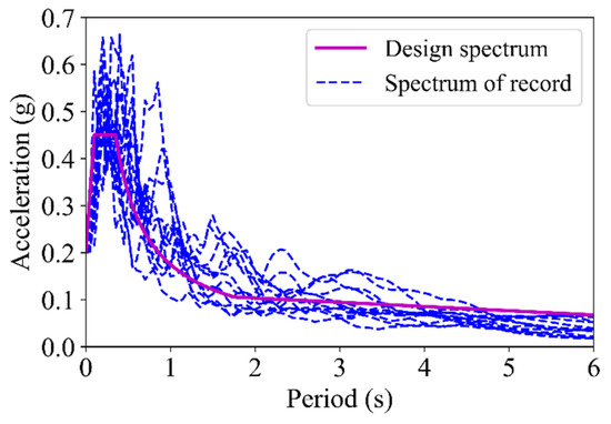 It was assumed that the site classification was II, and the seismic fortification intensity was 8. According to the requirements of seismic records for time history analysis in the current Chinese code for seismic design of buildings (GB50011-2010) [38], 12 records corresponding to the site condition were selected, which are listed in Table 1. The design spectrum from the seismic code and the response spectra of the selected earthquakes are shown in Figure 3. The maximum inter-storey drift angle is a widely accepted parameter for evaluating structural damage, and it was employed as EDP. The peak ground acceleration (PGA) is a commonly used index to measure the ground motion intensity, and it was adopted as IM in this study. Three performance levels, namely, immediate occupancy, life safety, and collapse prevention, were considered. With reference to the control target of the maximum inter-storey drift angle of steel structures corresponding to different failure states in GB50011-2010, the thresholds of these three performance levels were taken as = 1/200, = 1/100, and = 1/50, respectively.