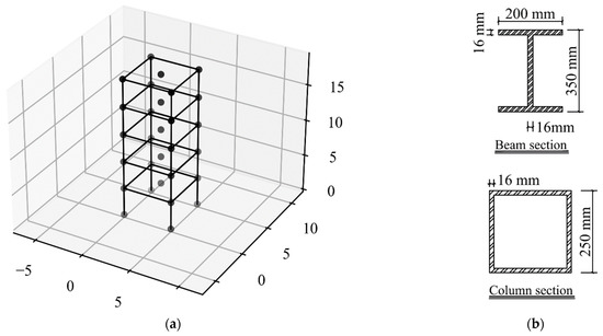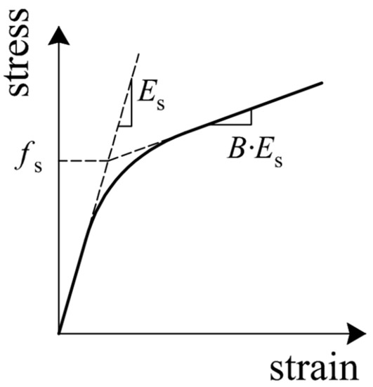The finite element model of the structure was constructed in OpenSeesPy (Figure 4a). The storey height was 3.8 m, and the span of each beam was 5 m. The density of steel was 7850 kg/m3. The cross-section information of beams and columns is shown in Figure 4b. The displacement-based beam–column element was adopted to model the beams and columns. The stress-strain behavior of steel was simulated by the Steel02 material (uniaxial Giuffre–Menegotto–Pinto material with isotropic strain hardening), where the strain-hardening ratio B was 0.02 and the three parameters controlling the transition of steel from elastic stage to hardening stage were 18, 0.925 and 0.15, respectively [39]. The material model is shown in Figure 5, where and represent the yield strength and initial elastic modulus of steel. The vertical load of 7 kN/m2 was uniformly distributed on each floor. The slabs were modeled through a diaphragm constraint at each floor [40]. Rayleigh damping model was used in dynamic analysis.