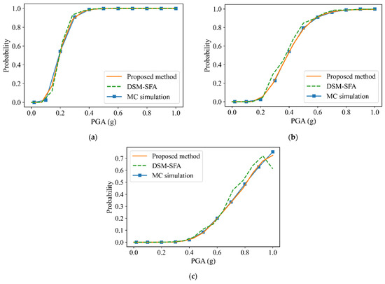 In the calculation of MC simulation, the MC samples were selected by LHS, and the number of samples was 1000. The failure probabilities of the structure were calculated for PGAs of 0.02, 0.1, 0.2, …, 1.0 g, respectively, and the number of calls to FEA to obtain the fragility curves was 1000 × 11. The fragility curves plotted by the proposed procedure had little difference from those by MC simulation, and the value of the former was only 0.4% of that of the latter. Since MC simulation is a very accurate reliability method, the closeness of the two results verifies the accuracy of the proposed method.