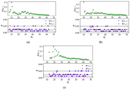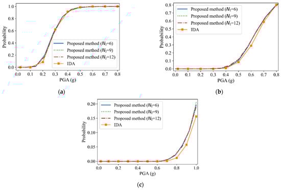 The seismic fragility of MFVCS was calculated using the proposed procedure in three different cases, in which the numbers of initial experiments NI were 6, 9, and 12, respectively. The values of , , and of the new samples in the sampling process are plotted in Figure 10. The fragility curves are plotted in Figure 11. The results of the three analyses were in good agreement, which indicates that the proposed method can obtain the fragility curves stably.