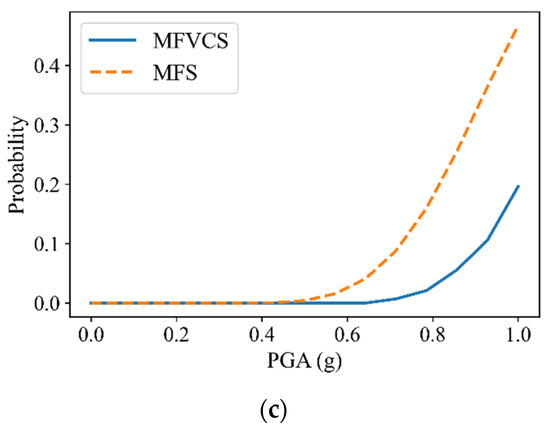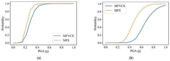 The fragility of MFS was also analyzed by the proposed method. The component arrangement of MFS is shown in Figure 8b. The member cross-sections were the same as those of MFVCS. Due to the absence of dampers, the parameters of the damping device were not considered in the fragility analysis. The statistical properties of other random parameters were the same as those of MFVCS. The number of calls to FEA in the calculation was 38. The fragility curves are shown in Figure 12. By comparing the curves of the two structures, it can be found that the failure probability of MFS is obviously higher than that of MFVCS under the same PGA, indicating that MFVCS is less vulnerable than MFS. Therefore, compared with MFS, MFVCS has better seismic performance. Compared with the previous studies on MFVCS based on IDA [14,47], this method can incorporate the randomness of structural parameters into fragility analysis, which provides more accurate reliability information for the seismic design of MFVCS.