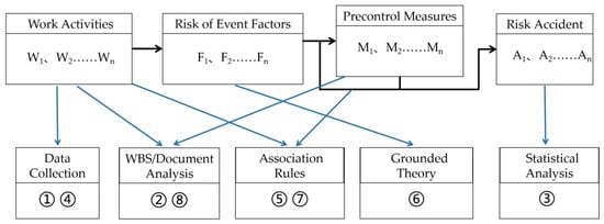 Figure 2 reflects the mapping relationship among W, F, A, and M in the construction safety risk management system for prefabricated buildings. The W set represents the work activities of all participants in the construction stage in a certain order. The A set represents the risk of accidents. The F set represents the influencing factors of accident risks. The M set corresponds to the preventive and control measures for accident risks. There are eight numbers in the figure, which represent the steps involved in the research process. The black arrows represent the path relationships among the four processes, and the blue arrows stand for the methods that need to be used among the four processes.