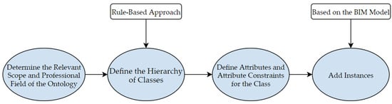 In the field of building safety management, rule-based approaches have attracted increasing research interest [36]. According to Studer et al., an ontology is a formal and explicit specification of a shared conceptualization [37]. In essence, ontology formalizes knowledge by classifying objects, attributes, and logical relationships between objects in a particular domain to facilitate the integration, retrieval, and reuse of information [38]. It plays an important role in the semantic representation and reuse of safety management knowledge [39]. One of the development trends in ontology technology in the field of construction engineering is the integration of ontology technology with BIM technology [20], so that the corresponding automatic risk identification and early warning systems can be designed and developed for risk management [40].
