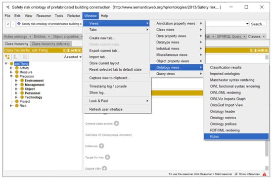 Furthermore, the automatic application of the risk rule base was realized. The safety risk rules were structurally expressed in the SWRL language with the semantic reasoning function, which can be recognized by means of a computer, and stored in the   Prot é g é 5.5 platform through the SWRL Tab plug-in. Figure 5 shows the Prot é g é interface for the input operation of the SWRL rule; its main interface path is: Windows/Views/Ontology views/Rules.