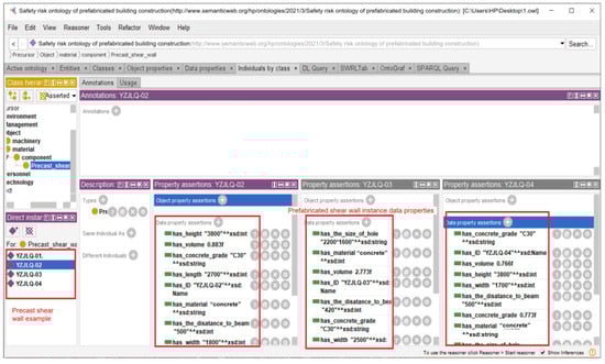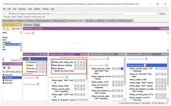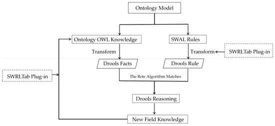 On the basis of ontology knowledge and the safety risk rule, the inference results were shown in the Prot é g é platform by means of the Drools reasoning engine, which provides support for the intelligent management of the construction safety risks for prefabricated buildings. A flowchart of the ontology reasoning process based on Drools is shown in Figure 6. There are two important tasks depicted in Figure 6. First, the ontology OWL knowledge and SWAL rules were transformed into Drools rule language. Second, the Rete algorithm was used to match the Drools rules to achieve reasoning, and the reasoning results were automatically updated in the ontology knowledge base.