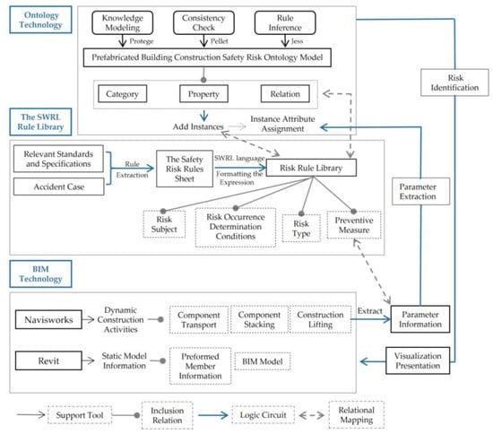 BIM technology, which has been widely used and is the mainstream technology used in the construction industry, has the following advantages. First, it enables participants in prefabricated building projects to communicate and obtain accurate building information. Second, it provides a reliable information-sharing and delivery platform for prefabricated building design, production, transportation, construction, and maintenance [12,13]. Compared with the traditional model, the intervention of BIM technology can improve work efficiency and quality, reduce errors and risks, and significantly reduce costs [14]. These advantages of BIM make it widely discussed, especially in relation to the safety risk management of prefabricated building construction, as it combines such advanced technologies as ontology, the Internet of things (IoT), and artificial intelligence (AI) [15,16,17]. However, research on this technology is still far from sufficient. First, the applications of ontology technologies in the construction industry have mainly taken place in traditional engineering fields [18] such as water conservancy, municipal administration, railways, subway engineering fields [19,20], etc. Construction in these fields uses traditional technological methods, which are less frequently involved in the field of safety management in prefabricated building projects. Second, although ontology technology has been applied to the construction industry, the automatic creation of ontology instances has seldom been created [21,22]. Finally, there are both cost and efficiency problems when BIM applications are developed separately, or when rules are expressed in code or in a proprietary format [23].