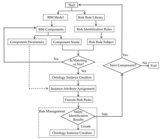 A flow diagram of the risk identification mechanism is presented in Figure 8. Specifically, when the identification program is started and the risk identification object is a specific component in the BIM model, the program matches the name of the component with the risk subject obtained from the rule base. The related component parameter information can be mapped onto the risk ontology via a detection algorithm, which automatically creates instances and matching attributes. Then, the risk state can be identified by means of SWRL rules and an inference engine in the   Prot é g é software. The corresponding measures are implemented when the risk state is determined to be “unsafe”. On the contrary, when the risk state is safe, the identification program will continue to detect the next component name, as shown in the flow chart. The intelligent identification mechanism of safety risk integrated with BIM technology and ontology technology is analyzed below. According to the different attributes of risk subjects, two different types of risk subjects are discussed in the BIM environment: the static prefabricated components in the design stage and the dynamic work activities in the construction stage. Then, the mechanism of intelligent risk identification is completed by combining ontology reasoning methods.