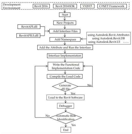 In addition, the intelligent risk management system was established through secondary development in the Revit software using the C# programming language. Through this system, the visual, automatic, and intelligent management in the design and construction stages of prefabricated buildings can be realized, and the safety risk management ability in relation to prefabricated buildings can be improved. The secondary development process implemented in the Revit software is clarified in Figure 9. With the continuous application of Revit secondary development technology, a relatively unified process step has been created, which includes analyzing requirements and new projects, adding interface files, adding namespaces, adding attributes to command classes and new classes, writing codes, compiling, loading, debugging, and other steps.