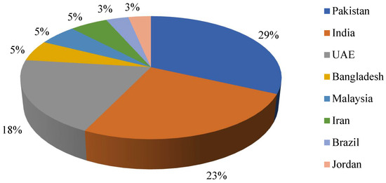The survey collected 62 responses, including 29% national (Pakistan) and 71% international responses. Responses were received from many countries, including Pakistan (29%), India (23%), UAE (18%), Bangladesh (5%), Malaysia (5%), Iran (5%), Brazil (3%), Jordan (3%), Saudi Arabia (2%), Morocco (2%), Kuwait (2%), Qatar (2%), Turkey (2%), and Oman (2%), as shown in Figure 2. As the focus of the study was limited to developing countries, responses were requested only from respondents in developing countries.