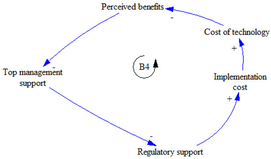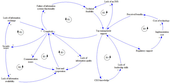 In the final stage, the shortlisted relations (as shown in Table 5) were used to develop a CLD, indicating the significant loops. The CLD in this study was developed using Vensim® software. Developing CLDs is a repetitive practice where connections among all variables are chronologically perceived and arranged using professional acumen. All eight barriers to IM, shortlisted in 20 relations, were used as top variables. All barriers were connected with other variables (factors) in the direction of impact. Each arrowhead carries a negative or positive polarity, indicating an inverse or direct relation with the next variable in the loop. The closed chains of causes and effects are called feedback loops [61]. Each loop was identified as a reinforcing or balancing loop based on its overall polarity.