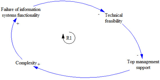The loop (R1) shows that ‘Failure of information systems functionality’ decreases technical feasibility, as evident from Figure 4. A decrease in technical feasibility decreases top management support, thereby increasing complexity. Further, an increase in the complexity of the system increases the failure of information systems functionality.