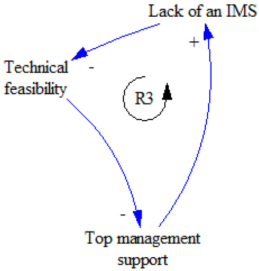 The loop (R3), as evident from Figure 6, shows that ‘Lack of an Information Management System (IMS)’ decreases technical feasibility, which decreases top management support in construction projects. Further, decreasing top management support increases the chances of not utilizing (or a lack of) an IM system. Hence, top management support is needed to adopt and implement an IMS in CSCs.